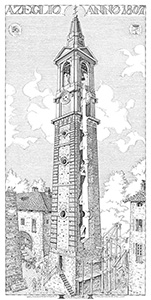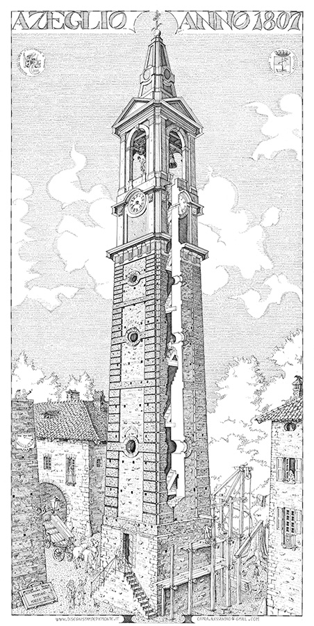 E’ il disegno del bellissimo campanile del paese di Azeglio, in canavese, che ben si vede dalla mia casa di campagna oltre il lago, con la sua forma svettante e snella. E’ rappresentato nel momento in cui viene smontato il ponteggio di costruzione, in un tardo pomeriggio di fine estate 1807.