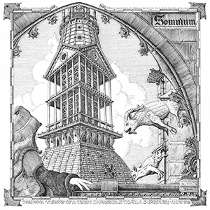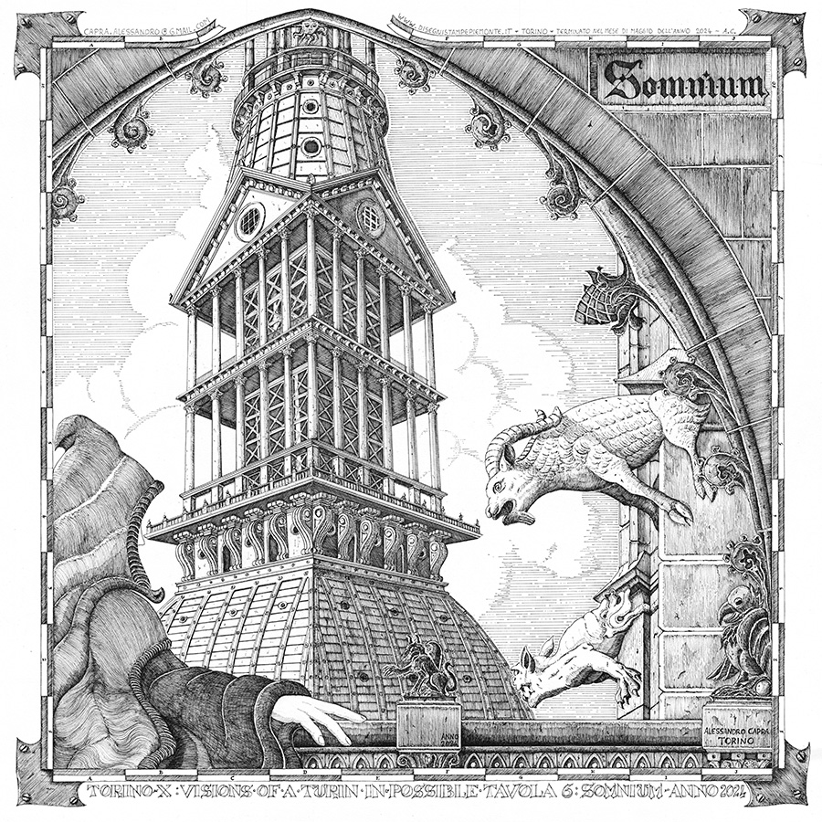 Questo sesto disegno raffigura la lanterna della Mole Antonelliana osservata da un antistante edificio gotico immaginario (una cattedrale?) di cui si notano i particolari decorativi flamboyant dell’arcata di una loggia e due gargoyles che si sporgono dai contrafforti.